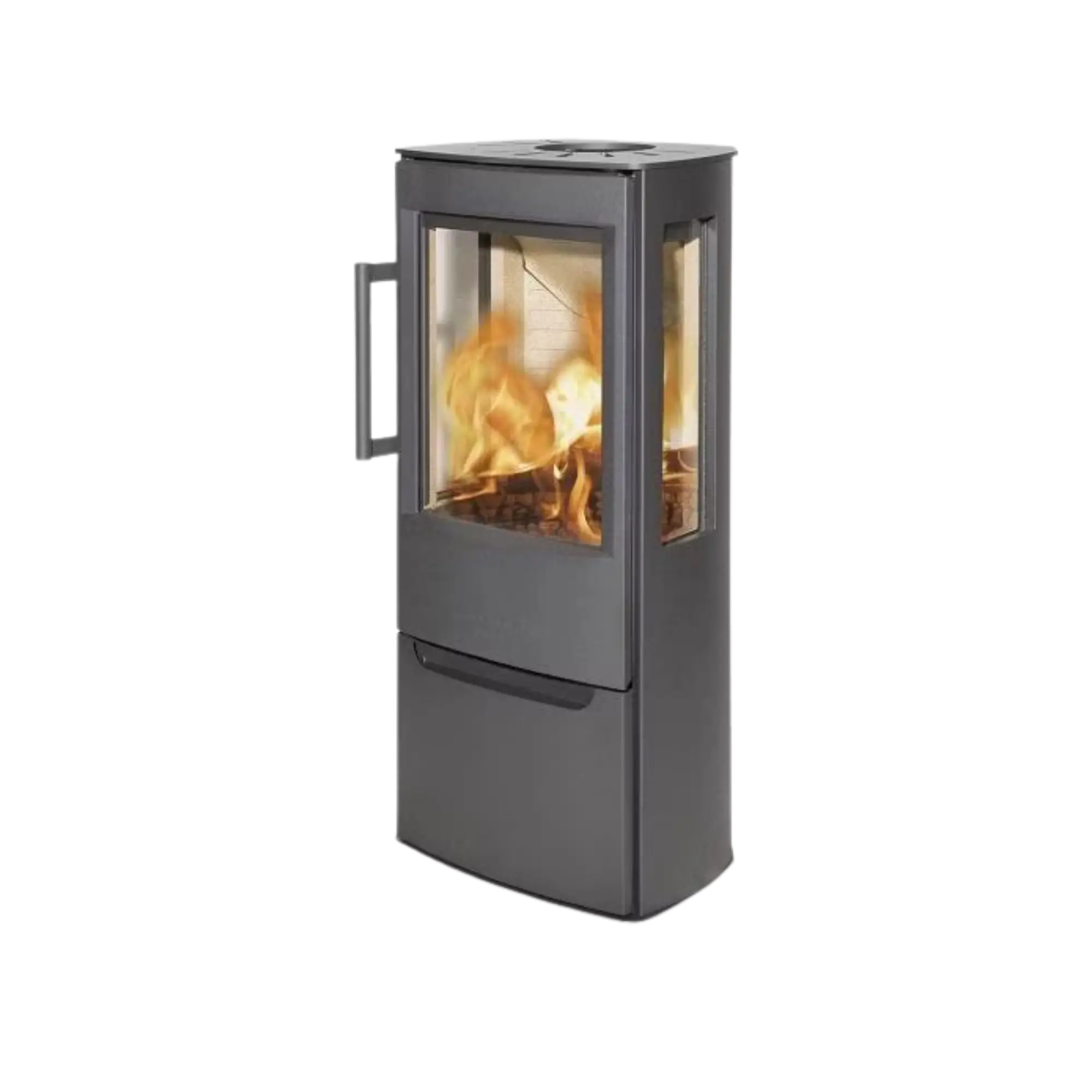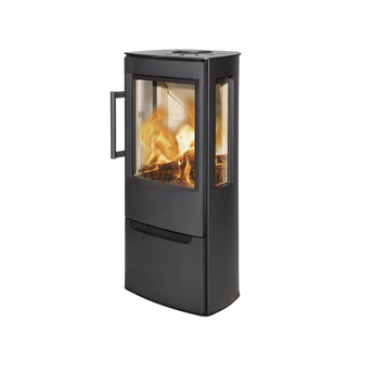 De breda sidoglasen och stora frontglasrutan ger dig en imponerande insyn till elden från flera vinklar, vilket skapar en varm, inbjudande atmosfär. Underluckan erbjuder praktisk förvaring – perfekt för tändmaterial eller handskar.